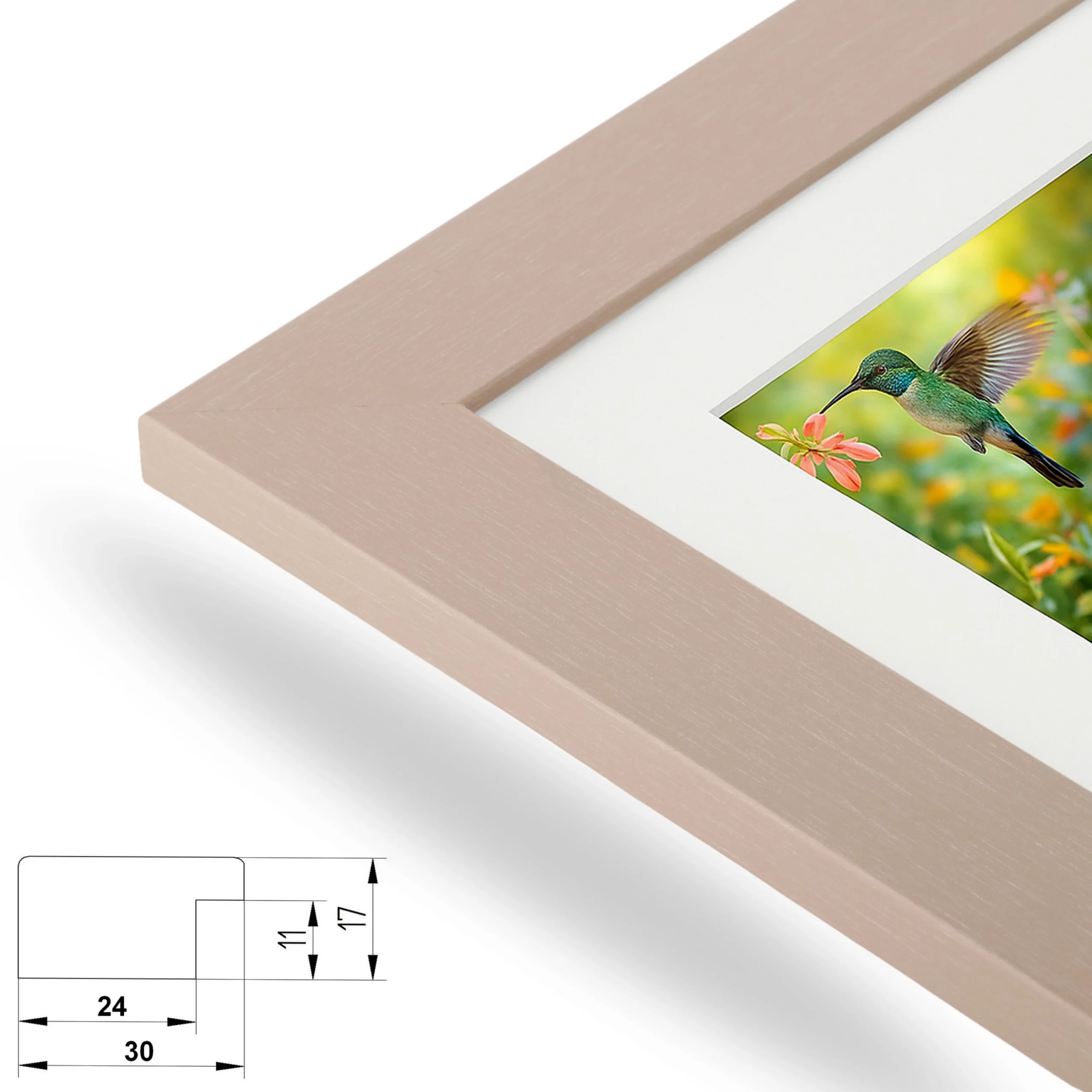 Präsentieren Sie Ihre schönsten Erinnerungen stilvoll mit unserem Bilderrahmen mit Passepartout. Der Rahmen überzeugt durch seine 40 mm breite MDF-Leiste in moderner Optik und sorgt für Stabilität sowie ein elegantes Erscheinungsbild.