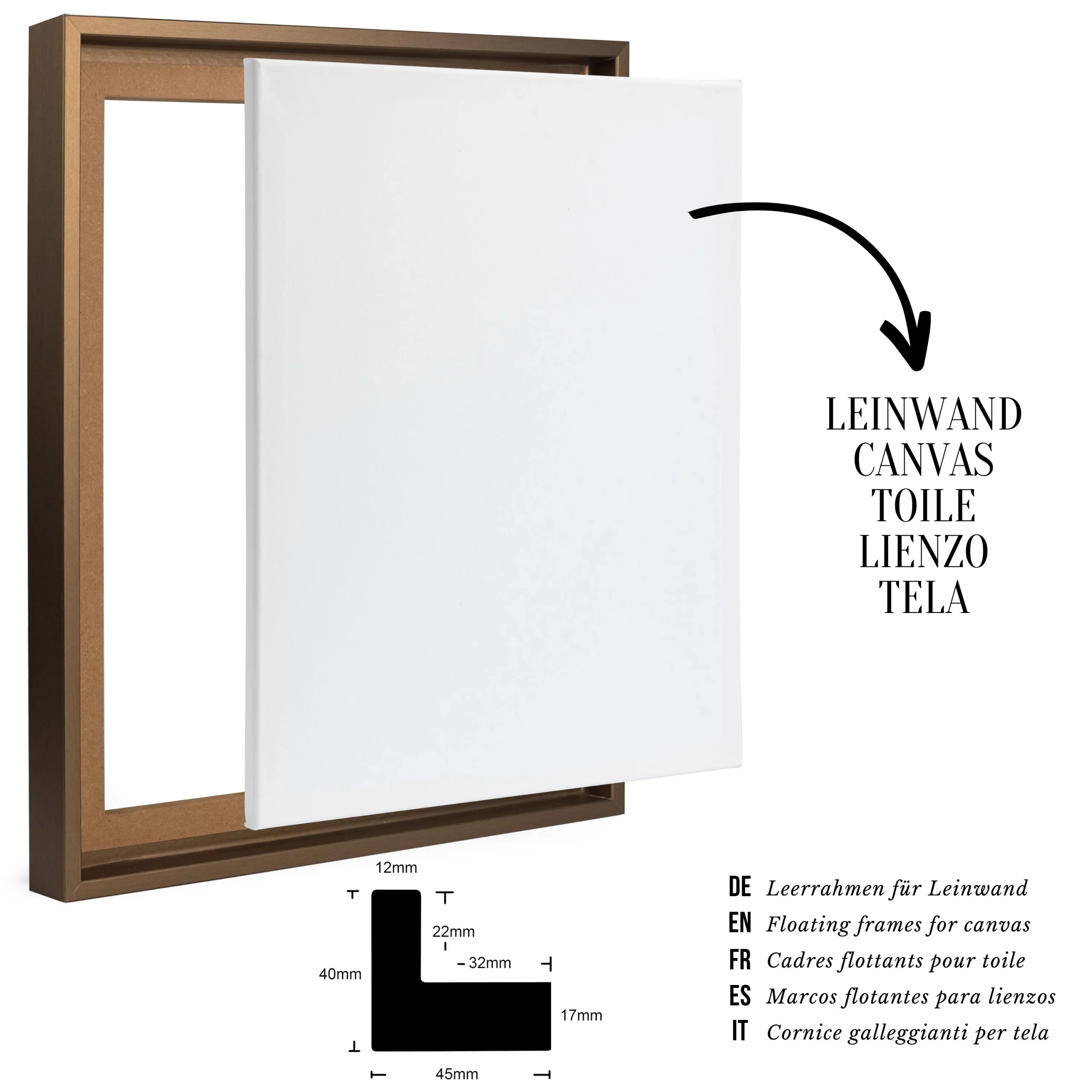 Die Keilrahmen sorgen für einen tollen Schwebeeffekt und besitzen eine Tiefe von 2,3 cm. Die Außenmaße des Schattenfugen-Rahmens sind 3,5 cm größer als das ausgewählte Format.