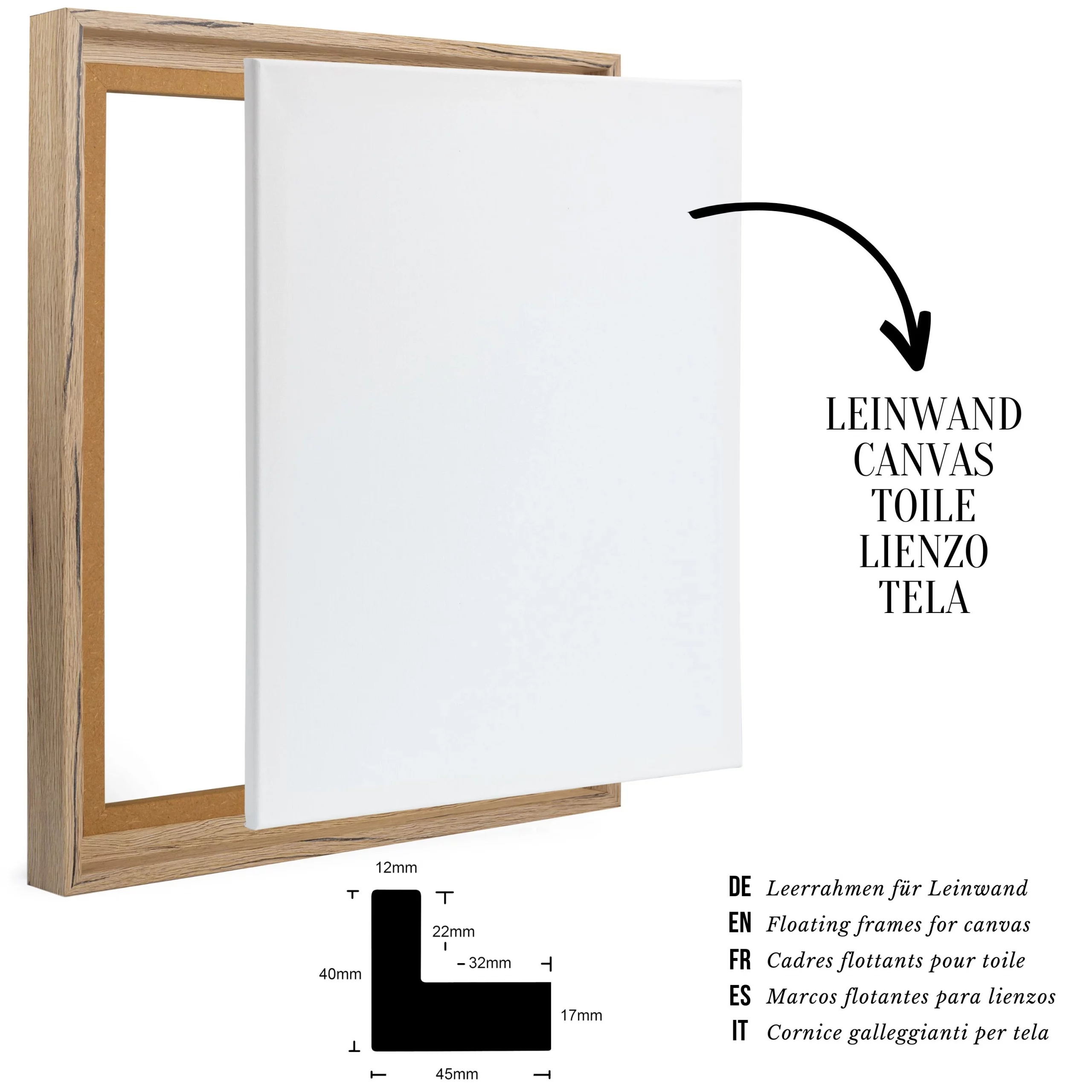 Die Keilrahmen sorgen für einen tollen Schwebeeffekt und besitzen eine Tiefe von 2,3 cm. Die Außenmaße des Schattenfugen-Rahmens sind 3,5 cm größer als das ausgewählte Format.