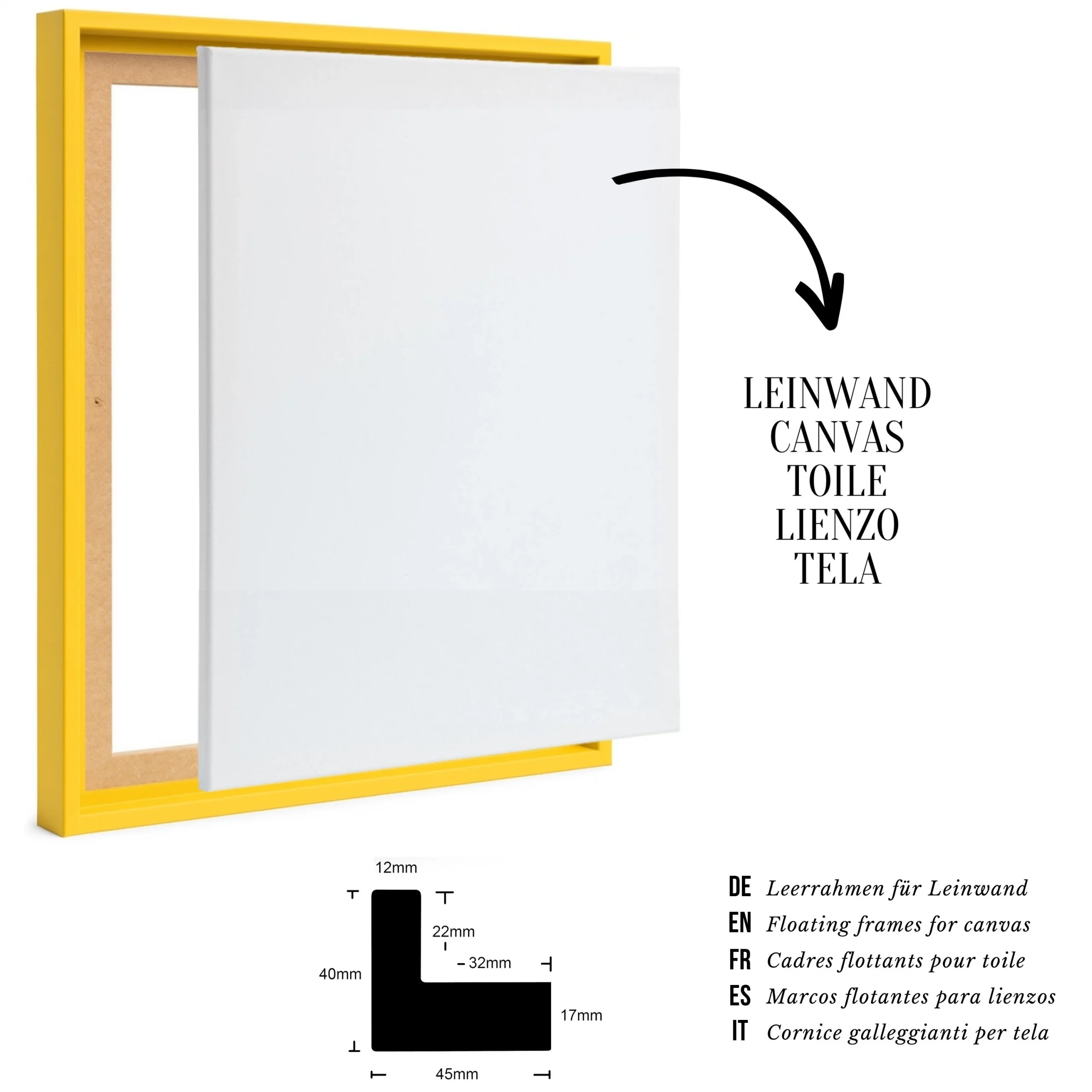 Die Keilrahmen sorgen für einen tollen Schwebeeffekt und besitzen eine Tiefe von 2,3 cm. Die Außenmaße des Schattenfugen-Rahmens sind 3,5 cm größer als das ausgewählte Format.
