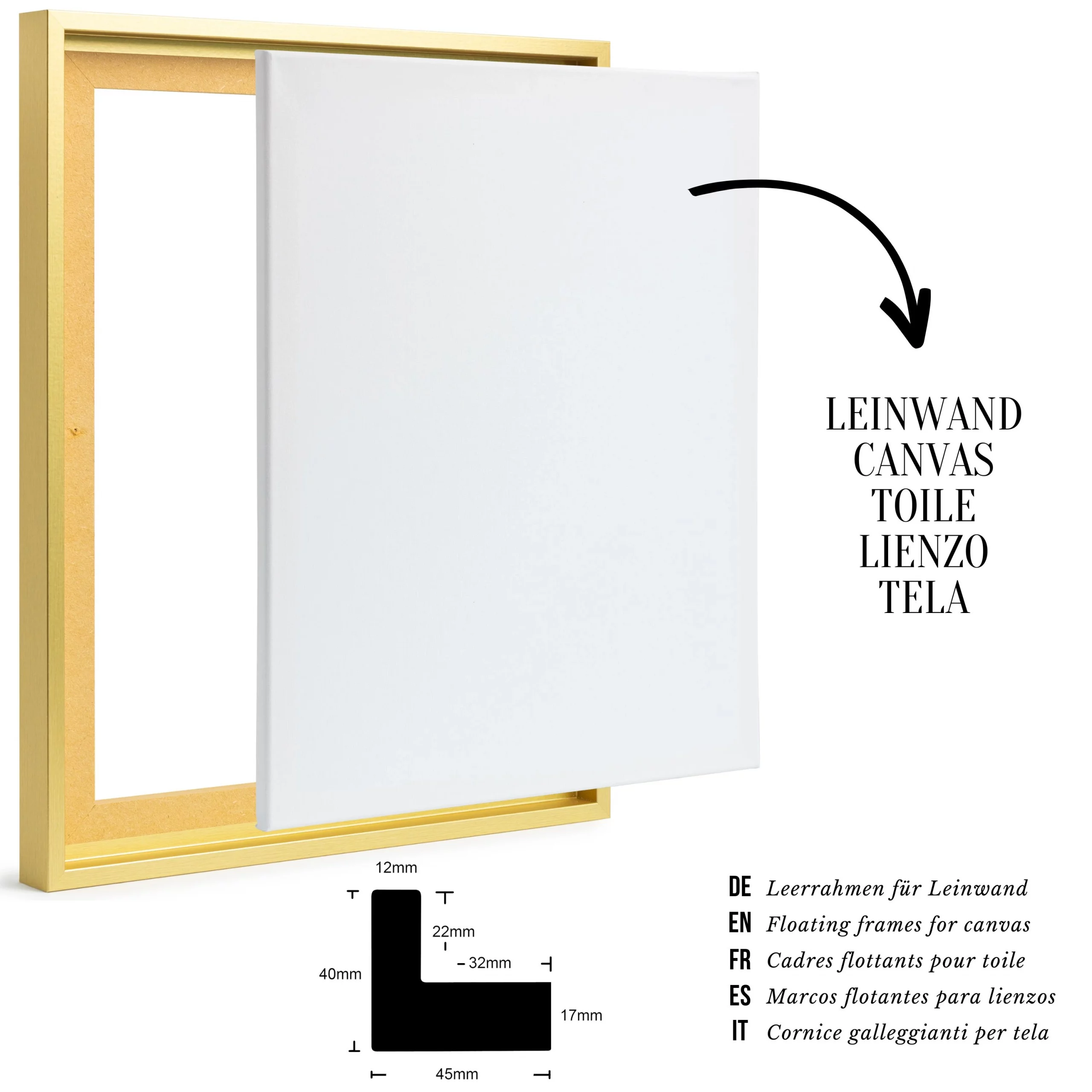 Die Keilrahmen sorgen für einen tollen Schwebeeffekt und besitzen eine Tiefe von 2,3 cm. Die Außenmaße des Schattenfugen-Rahmens sind 3,5 cm größer als das ausgewählte Format.