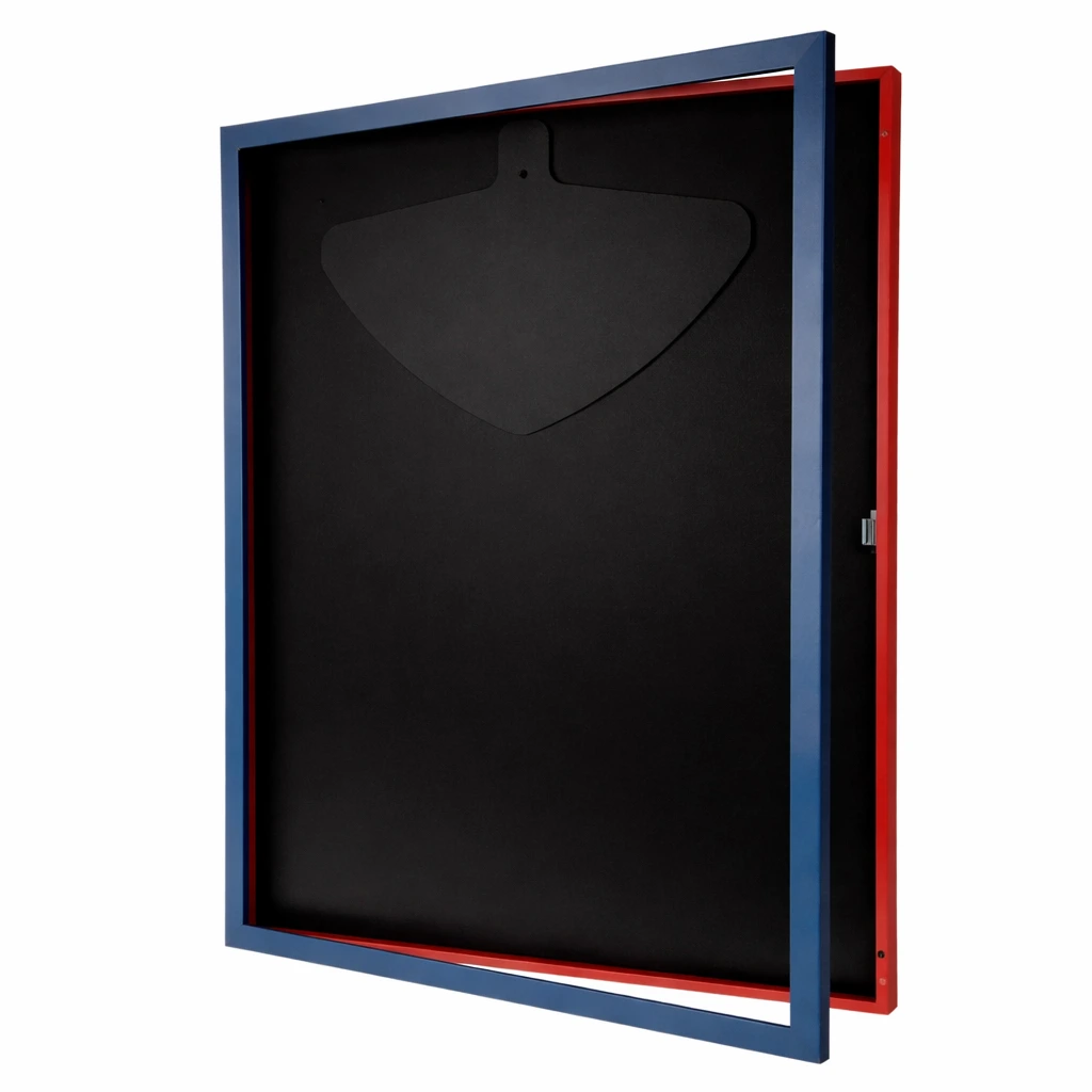 Unser exklusiver Trikotrahmen mit Drehtür ist die ideale Lösung für alle Sportfans und Sammler, die ihre Trikots professionell, stilvoll und gleichzeitig praktisch präsentieren möchten. Das Besondere an diesem Objektrahmen ist die Drehtür auf der Vorderseite, die durch einen Magnetschnäpper sicher geschlossen wird und ein einfaches Öffnen und Schließen ermöglicht, ohne dass der Rahmen von der Wand genommen werden muss. Dank dieser innovativen Konstruktion lassen sich Trikots, Sportshirts oder andere Erinnerungsstücke jederzeit unkompliziert austauschen. Gefertigt wird der Rahmen aus stabilem MDF-Holz, das mit einer hochwertigen Dekorfolie ummantelt ist, wodurch eine elegante und langlebige Optik entsteht. Die Frontscheibe besteht aus Acrylglas, das Ihr Trikot zuverlässig vor Staub, Schmutz und UV-Strahlen schützt und gleichzeitig für eine klare Sicht sorgt, sodass die Farben und Details Ihrer Sportbekleidung langfristig erhalten bleiben. Besonders praktisch ist die Möglichkeit, den Rahmen in verschiedenen Farben und Farbkombinationen zu bestellen, wodurch sich Vereins- und Nationalmannschaftstrikots perfekt mit den Rahmenfarben abstimmen lassen. Ob als persönliche Erinnerung an sportliche Erfolge, als Blickfang im Wohnzimmer, Büro oder Vereinsheim oder als Geschenkidee zu Geburtstagen, Jubiläen oder besonderen Sportevents – dieser Trikotrahmen ist ein absolutes Must-have für jeden Sportbegeisterten.