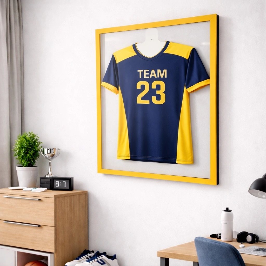 👉 Hochwertiger Objektrahmen: Bietet Platz für Objekte bis zu 30 mm Tiefe – Perfekt für Trikots, egal ob Fußball, Basketball, Handball oder T-Shirts – ideal für alle Sportfans.