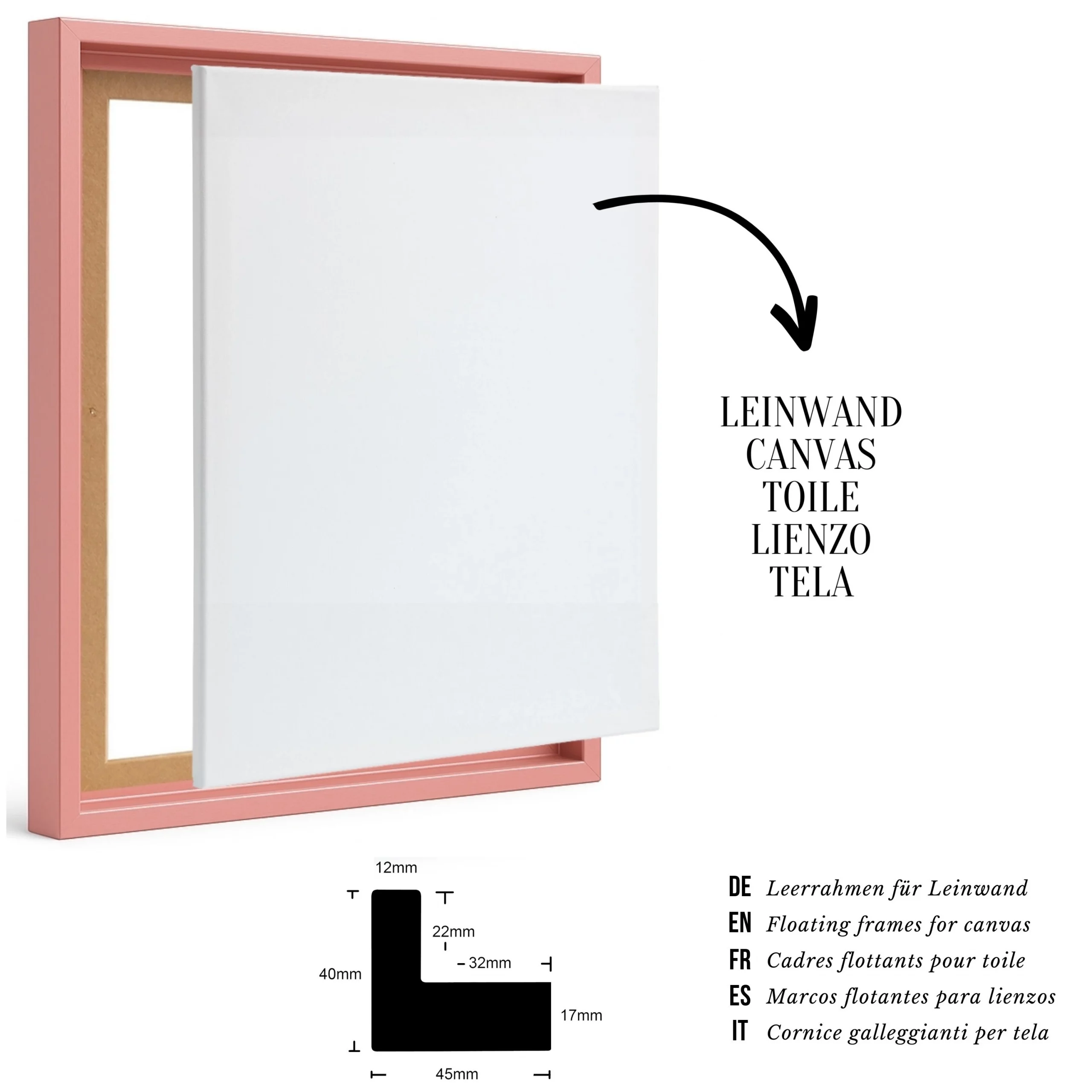 Die Keilrahmen sorgen für einen tollen Schwebeeffekt und besitzen eine Tiefe von 2,3 cm. Die Außenmaße des Schattenfugen-Rahmens sind 3,5 cm größer als das ausgewählte Format.